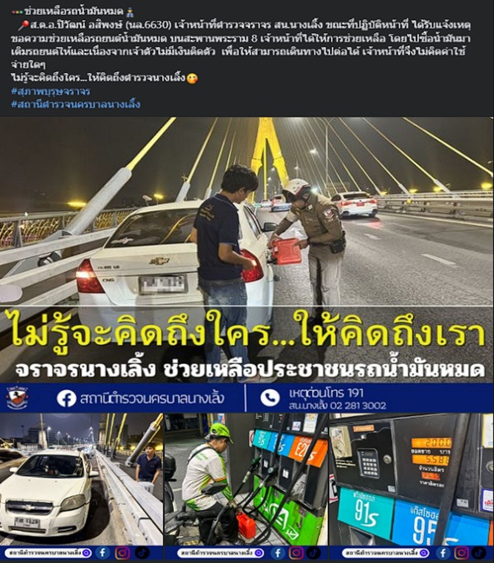 เมื่อวันที่ 11 มี.ค. 2567 เวลา 21.00น. เจ้าหน้าที่ตำรวจจราจรรับแจ้งเหตุรถยนต์ดับบนสะพานพระราม 8 ซึ่งเป็นพื้นที่ข้างเคียง สน.นางเลิ้ง ส.ต.อ.ปิยวัฒน์ อสิพงษ์ จึงได้ดำเนินการตรวจสอบ พบว่าน้ำมันเชื้อเพลิงรถหมด จึงได้ดำเนินการให้ความช่วยเหลือ ซื้อน้ำมันมาทำการเติมให้ เพื่อให้รถของประชาชนสามารถขับต่อไปได้ ตามโครงการ “สุภาพบุรุษจราจร ประชาชนสัญจรปลอดภัย”